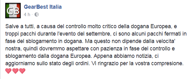 Allora può darsi che, come dice il messaggio di Gearbest Italia su Facebook, tutti i pacchi spediti il 2, 3 e 5 arrivino questa settimana, gli altri purtroppo (spediti dal 25 agosto al 6 settembre) devono aspettare i primi di ottobre. Il mio pacco fortunatamente era partito il 5 settembre. E’ stato comunque fermo a Londra 15 giorni !!